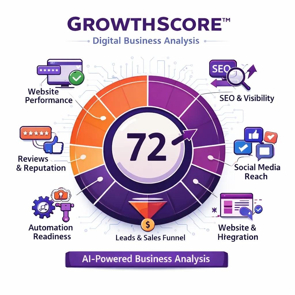 The score is based on a consistent checklist across key categories (website, SEO, trust, social, and systems readiness). It’s designed to give clear direction and quick wins.